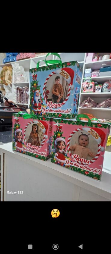 - Uşaqlar üçün adla fərdiləşdirilən hədiyyə qutuları: Yeni il mövzulu dizayn, üzərində uşağın fotosu, “2026” ili və “Yeni ilin mübarək!” yazısı, daşımaq üçün yaşıl lentli tutacaq.