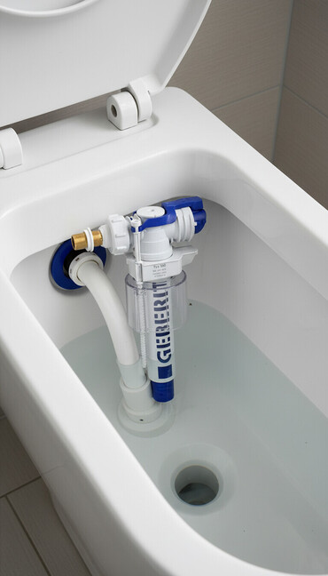 Səsi tənzimlənən kollektorlu döşəmə istilik paylayıcısı – 2 pilləli paslanmayan poladdan kollektor bloku – Üst xətt: axın tənzimləmə qapaqları (mavi), hər xətt üçün ayrı-ayrılıqda əl tənzimlənmə...