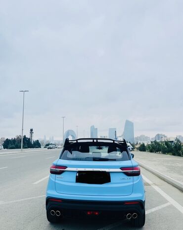 Geely Coolray – şəhər krossoveri, parlaq mavi kuzov və idman üslublu detallarla.