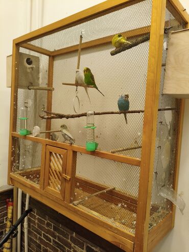 - Sağ tərəfdə yuvalama üçün taxta quş yuvası/qutusu və giriş perch-i.