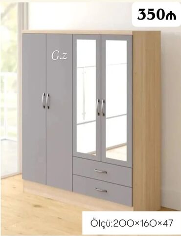 - Model 1: 200×120×47 sm, ağ rəng. Daxili quruluş: 1 ədəd asqı bölməsi, 4 ədəd rəf, 3 ədəd çekmece. Qiymət: 230₼. Çatdırılma ödənişsiz.
