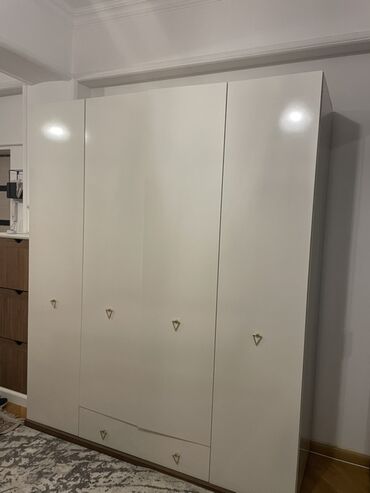 Ağ rəngli, parlaq (laklı) səthə malik üçqapılı geyim şkafı. Minimalist dizayn, qapılarda dekorativ ürək formalı tutacaqlar. Korpus ağ, alt hissədə taxta rəngli baza ilə tamamlanıb.