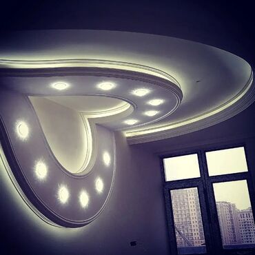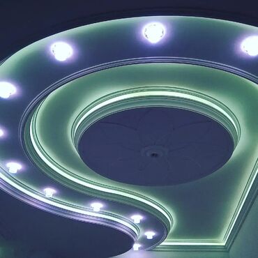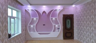 Fotoşəkillərdə nümunə tavan formaları, LED işıqlandırmalı kompozisiyalar və TV divar nişi göstərilib. Dizayn və ölçülər tam müştərinin interyerinə uyğun hazırlanır.