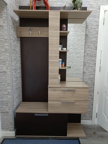 Dəhliz üçün çoxfunksiyalı mebel dəsti - Tərkib: şkaf, böyük tam boy güzgülü qapı, açıq asılqan paneli, yuxarı rəf, ayaqqabılıq bölməsi və çekmece. - Material: açıq ağac tonlarında laminat/LDSP, me...
