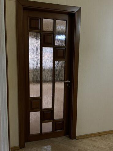 - Daxili qapı: şüşəli dizayn (şüşə panellər rellef teksturalı, işığı keçirir, məxfiliyi qoruyur), dekorativ çərçivələr, uyğun qəhvəyi qutu və plintuslar