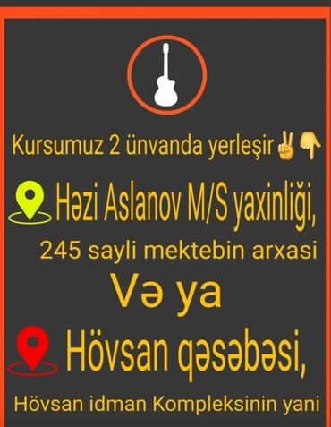 Gitara kursu 🎸🤩🎸🎸🎸 ✅Dərslər həftədə 2 dəfə, hər dərs 1 saat ✅Fərdi, qrup və ya onlayn format ✅Aylıq ödəniş: Fərdi 60 AZN, Qrup 40 AZN ✅Onlayn bir dərs: 5AZN ✅Yalnız bu ay qeydiyyatdan keçənlə...