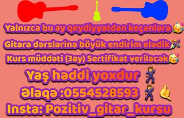 Pozitiv.gitar.kursu gitar derslerine Boyuk endirim eledi🤗Dərslərimiz həftədə 2 dəfə hər dərsin müddəti 1saat olmağla(Fərdi, qrup və ya Online) keçirilir 🥳. Kursun müddəti (3ay) sonunda size diplom(...