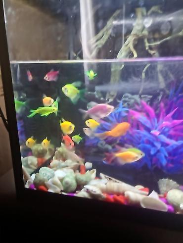 - Şəkillərdə geniş akvarium, dekorativ bitkilər və rəngli çınqıllar nümayiş olunur; balıqlar neon işıqlandırma altında canlı rənglər göstərir.