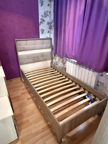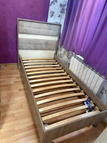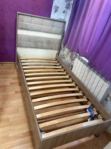- Tək nəfərlik çarpayı karkası: lamelli altlıq, yumşaq düyməli başlıq (parça üzlü), taxta korpus.