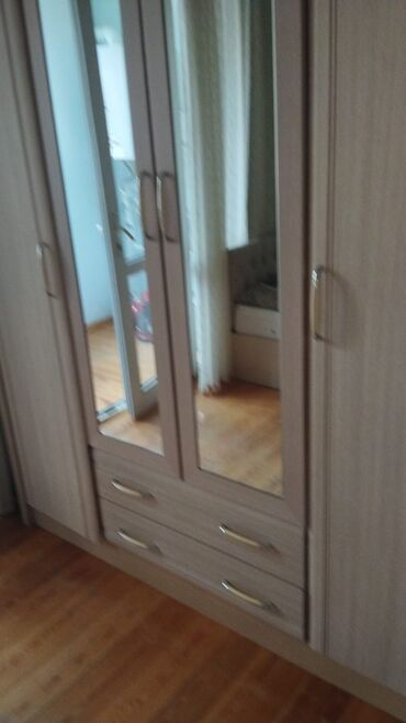- İki ədəd üçqapılı şkaf: hər ikisi güzgülü ön qapaqlara malikdir, içəridə asılqan və rəf bölmələri; alt hissədə iri çekmecələr. Qoltuqları metal tutacaqlıdır. Bir şkaf açıq rəng ağac teksturalı, digəri ağ-qırmızı dekorlu ön panel və oval güzgü ilə.