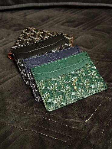 - Fotoşəkillərdə göstərilənlər: Hər rəngdə kartlıqlar və bir ədəd qəhvəyi Goyard pulqabı; kartlığın mərkəzi cibində nağd saxlanılması nümunəsi