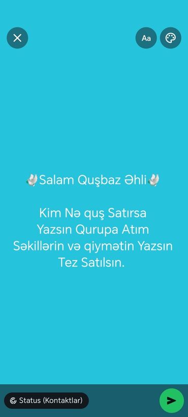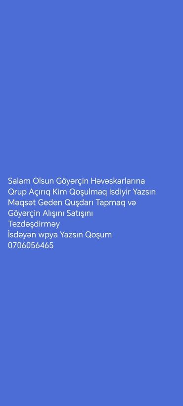 Qeyd: Paylaşımlarda şəkillər və qiymət məlumatı əlavə edilə bilər ki, elanlar tez görülsün. Göyərçinlə bağlı elanlarını və məlumatlarını qrupda yaza bilərsiniz.