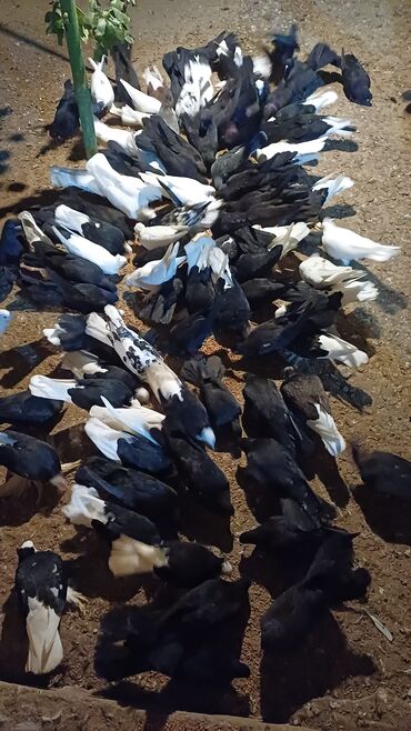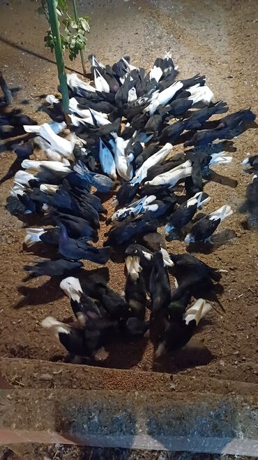 - Şəkildə çoxsaylı ev göyərçinləri görünür: qara, ağ və qara-ağ naxışlı fərdlər.