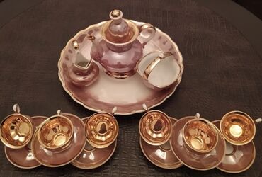 Gədim sovet gəhfə servizi,rusiyanın,bufetdə galıb,işlınməyib,6 fincan,6 nəlbəki, süd gabı, çaydan,bir dənə şəkər gabısı yoxdur,gırılıb ,heç bir sınığı,gırıntısı yoxdur 25man