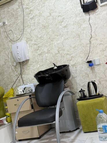 - Salon üçün saç yuma kreslosu: yumşaq qara oturacaq, quraşdırılmış qara yuma qabı, metal qollar, su bağlantısı üçün hazır baza.