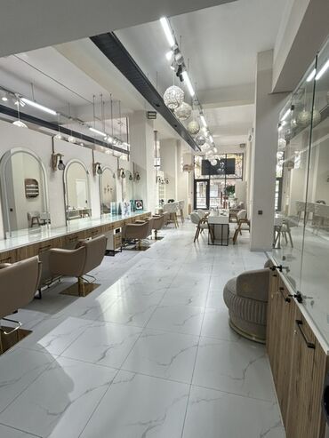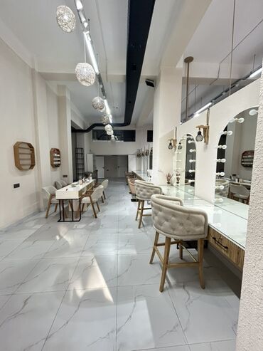 - Saç ustaları üçün iş yerləri: uzun güzgü paneli boyunca bir neçə peşəkar kreslo (bej rəng, hidravlik baza), çekmecəli iş masaları, güzgü yanlarında divar lampaları və aksesuar polkaları.