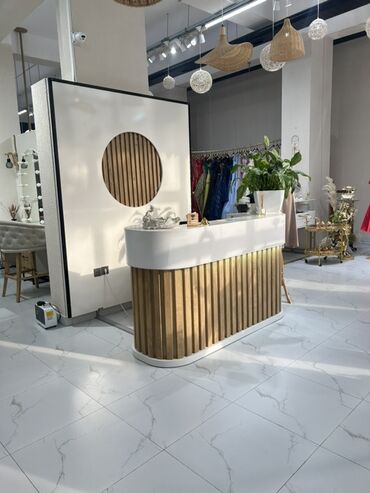- Resepsiyon zonası: yumru künclü, ağ üstlü və şaquli ağac lamelləri ilə bəzədilmiş stend; dekorativ panel və elektrik çıxışları.