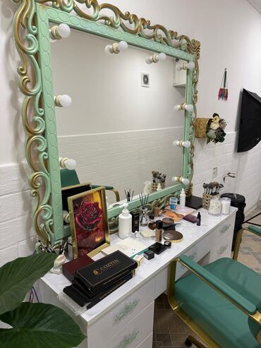 - Vizaj/saç kəsimi üçün iş masası: geniş mərmər-effektli stolüstü, hər iki tərəfdə çekmecələr, metal-qızılı-firuzəyi detallar.