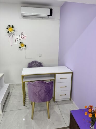 - Manikür/pedikür masası: Ağ mərmər effektli üstlük, qızılı metal karkas, 3 çekmecəli blok, yan hissədə iki səviyyəli şüşə vitrin rəfləri. İş səthi altında əlavə rəf zonası.