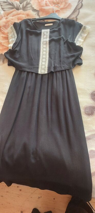 GRAZZYA markalı qadın paltarı - Rəng: Qara - Ölçü: 46 (etiketdə göstərilib) - Model: Maxi uzunluqda, yuxarı hissəsi bol kəsimli ikiqat effektli - Yaxa: Dairəvi - Qol: Qısa, krem rəngli krujeva bəz...