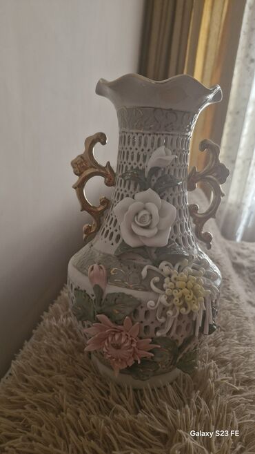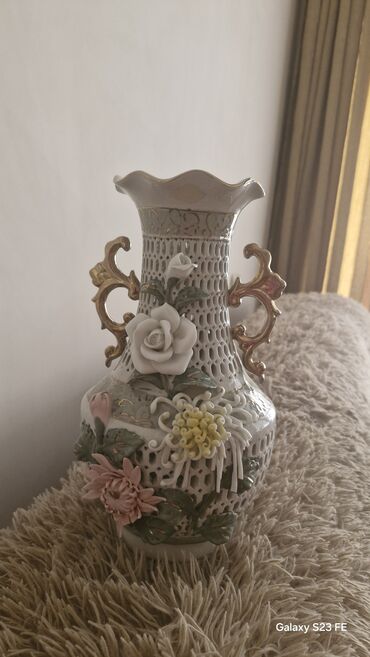 Dekorativ güldan ağ və yaşıl tonlarda, üzərində çiçək naxışları ilə bəzədilmişdir. Güldanın yuxarı və aşağı hissəsində torvari açıq işləmə dizaynı mövcuddur. Hər iki tərəfində qızılı rəngli qulp detalları var. Bu güldan interyerə zəriflik qataraq, istənilən otaqda diqqət çəkən bir dekorativ əşya kimi istifadə edilə bilər. Qədimi üslubda dizayn edilmiş bu güldan həm ev, həm də ofis dekorasiyası üçün uyğundur.