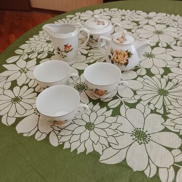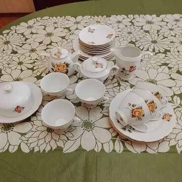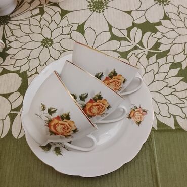 Porselen çay dəsti – gül naxışlı, qızılı kənarlı
