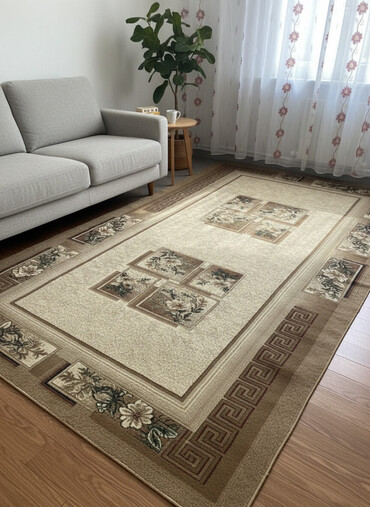 Bej rəngli, üzərində kvadrat formalı gül naxışları olan xalı. Xalının ətrafı həndəsi ornamentlərlə bəzədilib. Otağa rahatlıq və zəriflik qatır. Ölçü 3.95-1.94 sm