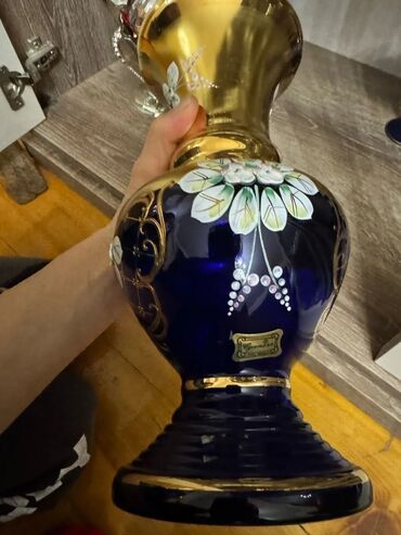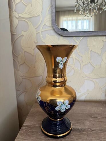 Bogem şüşəsindən hazırlanmış, qızılı rəngli, çiçək naxışlı vaza.Sovet vaxtı alınıb. Geniş ağızlı və möhkəm oturacaqlı bu vaza, ev dekorasiyası üçün uyğundur.hündürlüyü 26sm, diametri 10sm. Üzərində...