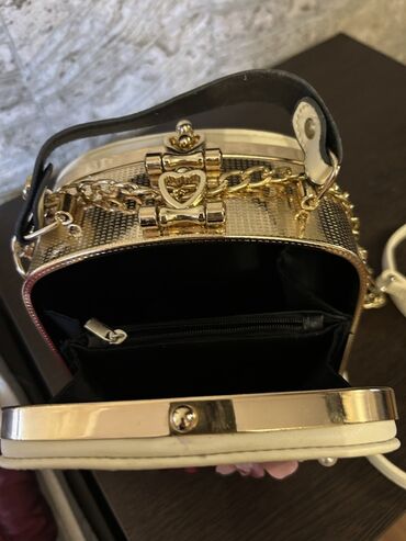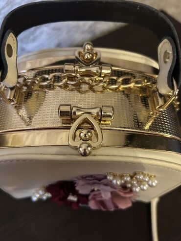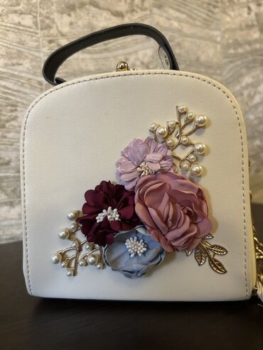 İşlənmişZərif və dəbli dizaynı ilə seçilən, krem rəngli, kvadrat formalı çanta. Çantanın üzərində müxtəlif rəngli güllərdən ibarət bəzək vurulub, həmçinin incilərlə də işlənilib. Qızılı rəngli metal aksesuarları və zəncirvari qayışı çantaya xüsusi cazibə qatır. İçərisində kiçik cibləri var, əşyalarınızı səliqəli saxlamaq üçün idealdır. Ən gözəl tərəfi Üzərindəki çiçəklərin rəng seçimləri ilə geyindiyiniz bir çox paltara uyğun gəıməsidir. Gəlin xonçamda gəlib bir dəfə istifadə eləmişəm. Baha alınıb