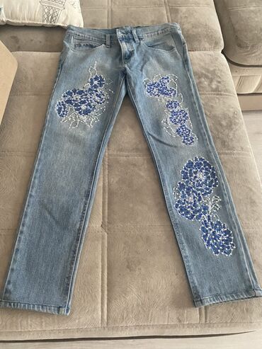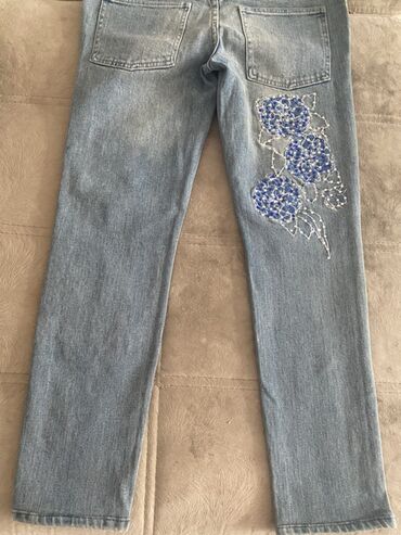 - Hər iki balaqda bənövşəyi-mavi və ağ tonlarda əl işi naxışlı appliqasiya: çiçək motivləri və yarpaq konturları