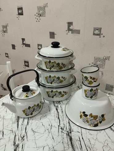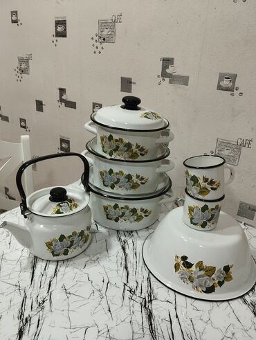 Qazan dest emal rus 🇷🇺Rusiya istehsalı 14predmetli "xoruzlu" emal dəst:( qulpluca 1,5litr / /bidon 3,5litr / qazanlar 0,6litr -1,45litr-2litr-3litr-4,3litr /dəm çayniki 1litr / çaydan 3,5litr /...