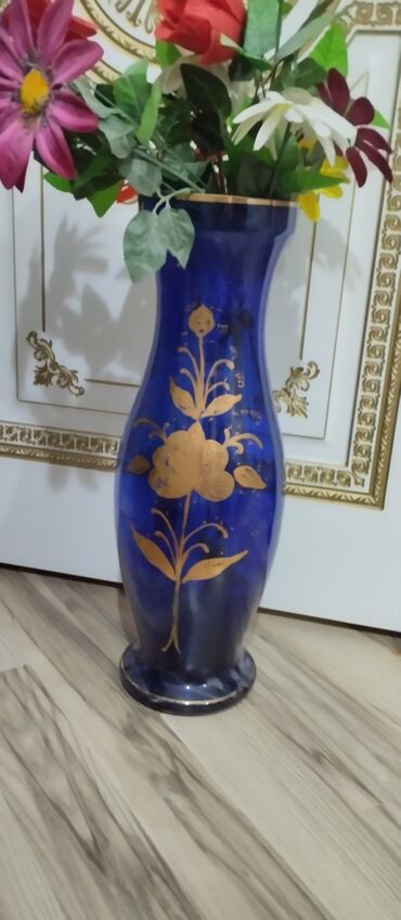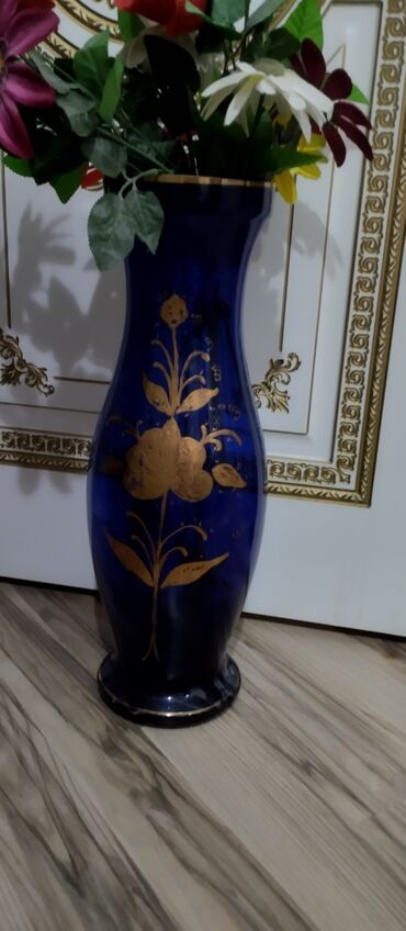 Bəzəkli şüşə vaza - Material: qalın şüşə - Rəng: tünd kobalt-mavi korpus, qızılı örtüklü üst və alt hissə - Dekor: əl işinə bənzər qızılı relyef naxışlar və çiçək kompozisiyası (ağ-çəhrayı çiçəklə...