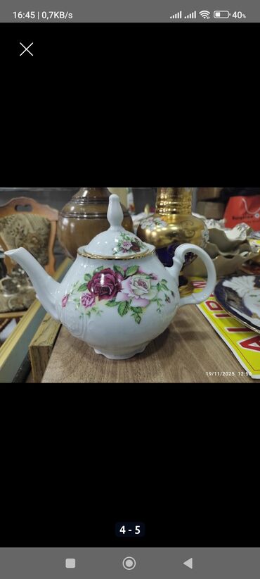 Porselen dekorativ çaydan böyük - Material: porselen/keramika gövdə və qapaq - Rəng və naxış: krem əsaslı, çoxrəngli klassik-şərq üslubunda çiçək və ornament naxışları; ağız və qapaq hissəsində i...