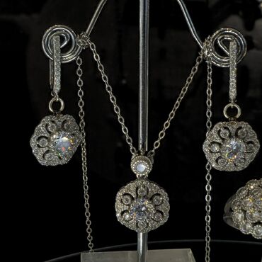 Gümüş rəngli zərgərlik dəsti – üzük və sırğalar - Dizayn: Sferik/yarımkürə formasında açıq işlikli (filigranvari) karkas. Hər hissə “çiçək” motivli qəfəs naxışı ilə hazırlanıb. - Bəzəklər: Karkası...