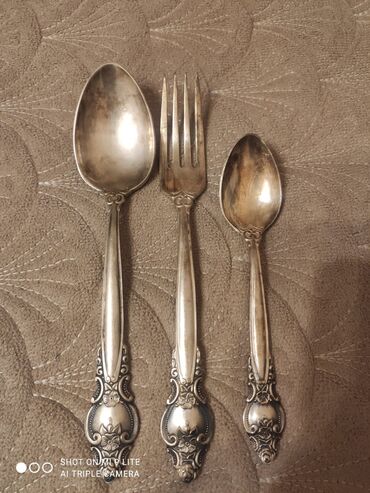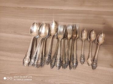 Antik üslublu metal süfrə dəsti - Tərkib: 3 qrupdan ibarət yemək qaşıqları, çay qaşıqları və çəngəllər (hər qrupda bir neçə ədəd, şəkillərdə göründüyü kimi birlikdə bağlanıb). - Material: gümüş rə...