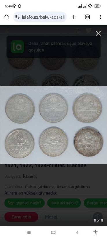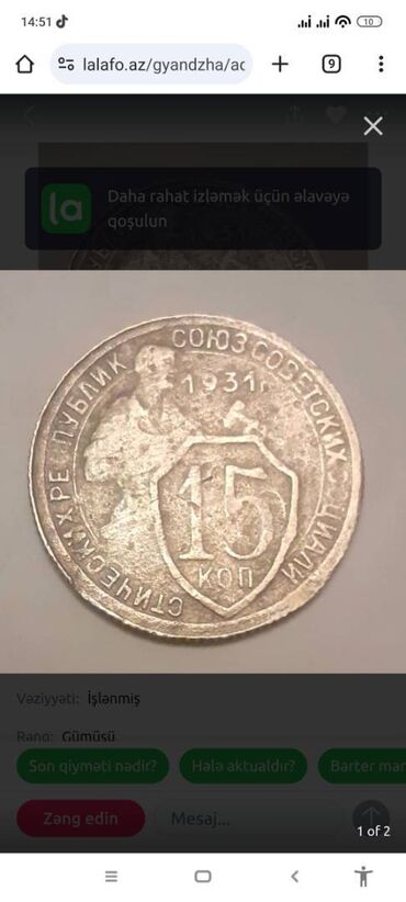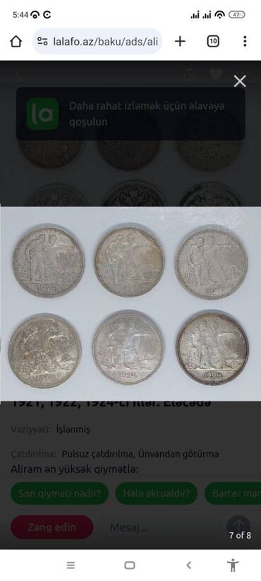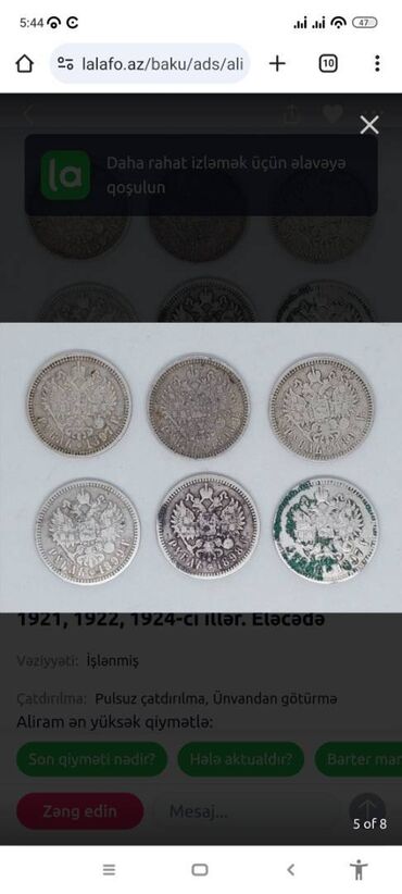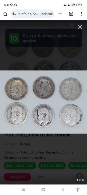 Gümüş qəpiklər və əşyalar alıram, yüksək qiymətə. Əziyi, cızığı olanları da götürürəm. Yalnız gümüş olanları alıram.