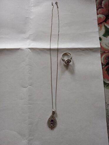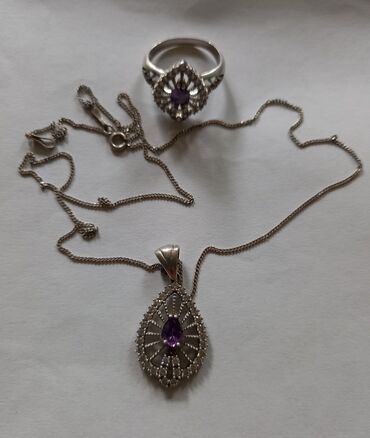 Gümüş zərgərlik dəsti: - 1 ədəd zəncirli boyunbağı, dairəvi qarmaqlı kilidli. Kilidin yanında “925” damğası görünür. - 1 ədəd asma: armud formalı dizayn, mərkəzdə bənövşəyi daş (ametist üslubunda),...
