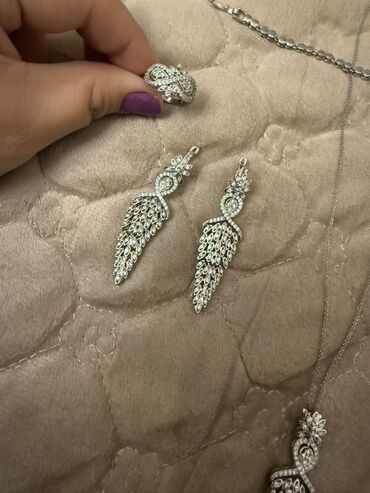 Zərif gümüş bəzək dəsti - Üzük – Kəpənək formalı, parlaq daşlarla bəzədilmiş dizayn. Zərif gümüş halqada asimmetrik qanad detalları ilə diqqətçəkən görünüş. - Üzük – Minimalist “V” formalı model, ...