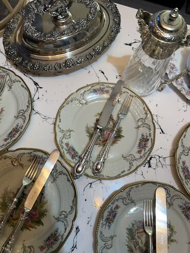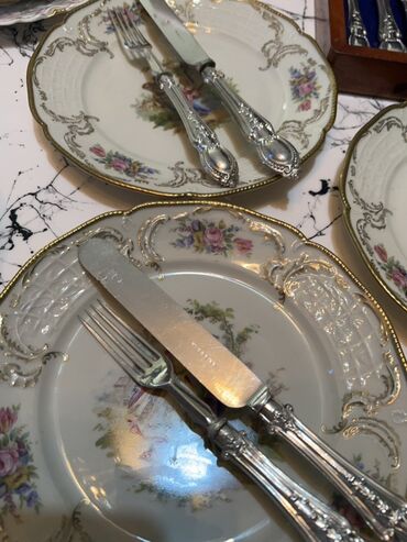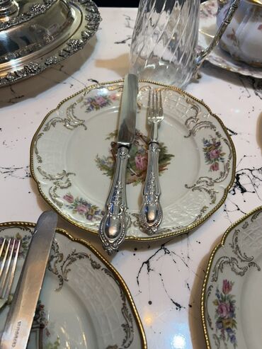 Antik gümüş örtüklü süfrə ləvazimatları dəsti - Naxışlı klassik dizayn: qulplarda relyef floral ornamentlər - Üzərində damğalar: “НЕРЖ” (paslanmayan polad bıçaq tiyələri), “МНЦ” və “МЕЛЬХИОР” (mel...