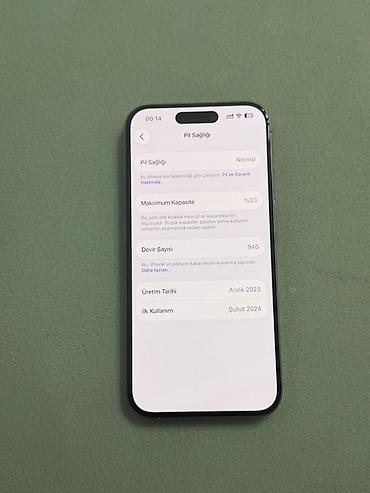 Qeyd: Şəkillərdə həm arxa, həm ön panel və Pil Sağlığı bölməsinin məlumatları göstərilir. Model Pro xəttinə aid olub üçlü kamera və Dynamic Island ilə ayırd edilir.