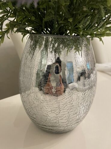 Metallik dekorativ vaz - Material: parlaq xrom rəngli metal ərintisi - Forma: yastı-yuvarlaq, üst hissədə asimmetrik, damcı formalı açılış - Rəng: güzgü effekti verən gümüşü xarici səth, tünd (yaş...