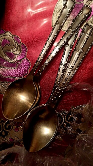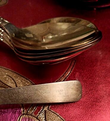 Antik gümüş örtüklü süfrə ləvazimatları dəsti - Naxışlı klassik dizayn: qulplarda relyef floral ornamentlər - Üzərində damğalar: “НЕРЖ” (paslanmayan polad bıçaq tiyələri), “МНЦ” və “МЕЛЬХИОР” (mel...