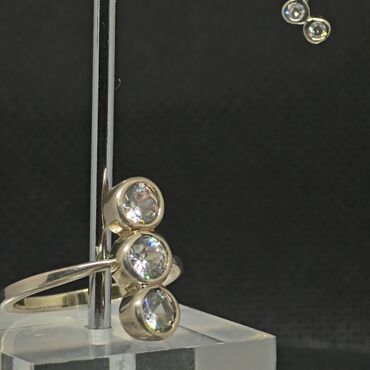 SırğaŞəffaf daşlarla bəzədilmiş bu zərif gümüş dəstə üzük və sırğalar daxildir. Üzükdə ardıcıl düzülmüş üç böyük, daş, sırğalarda isə müxtəlif ölçülü beş dəyirmi daş qrupu var. Hər bir daş zərif bir çərçivəyə bərkidilib. Bu dəst zərif görünüşü ilə gündəlik istifadə və ya xüsusi hallar üçün uyğundur.