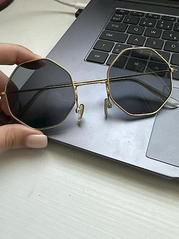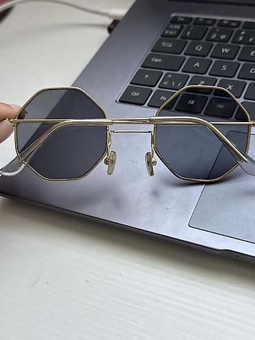 Stilini tamamlayan fərqli çoxbucaqlı kəsim və qızılı metal çərçivə ilə diqqətçəkən gün eynəyi.