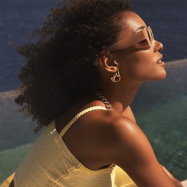 Gün eynəkləri seti – 3 ədəd 1) Qızılı çərçivəli, vizor tipli model - Çərçivə: metal, qızılı rəng - Linza: iri ölçülü, təkparça “shield/visor” dizaynı, qəhvəyi gradient ton - Körpü və burun dayaqla...