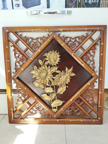 - Material: təbii ağac karkas və oyma elementlər, mərkəzdə qızılı tonlarda günəbaxan çiçəklərinin relyef kompozisiyası (metal və ya polimer örtüklü).