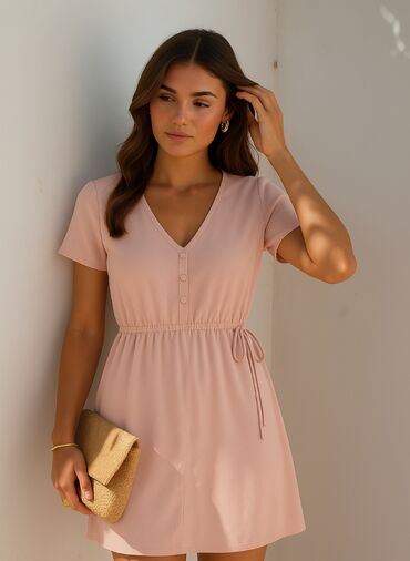 Məhsul: Bik Bok qadın paltarı - Rəng: pudra/solğun çəhrayı - Ölçü: XS (etiketdə göstərilib) - Model: incə askılı, V-kəsimli üst hissə - Arxa hissə: dekorativ çarpaz (criss-cross) askılar - Bel xət...