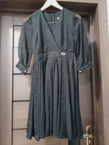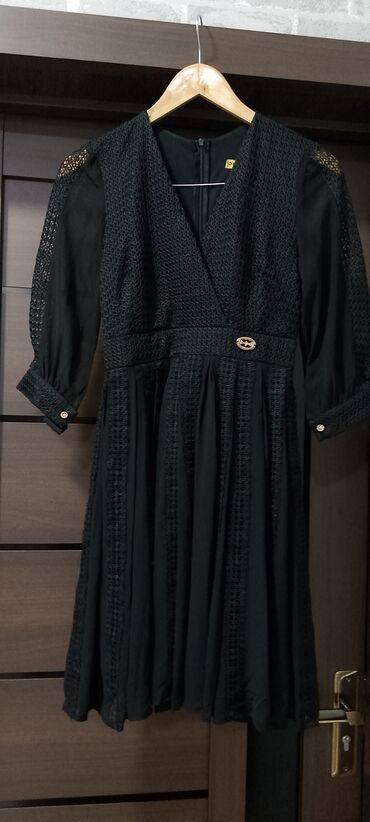 Qara klassik qadın donu L razmer - Rəng: tam qara - Kəsim: yüngül dar, dizə yaxın uzunluq - Yaxa: V formalı, xırda bəzək daşları/boncuklarla işlənmiş - Qol: qısa qol - Material: nazik, elastik tri...