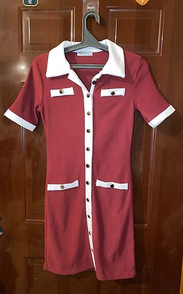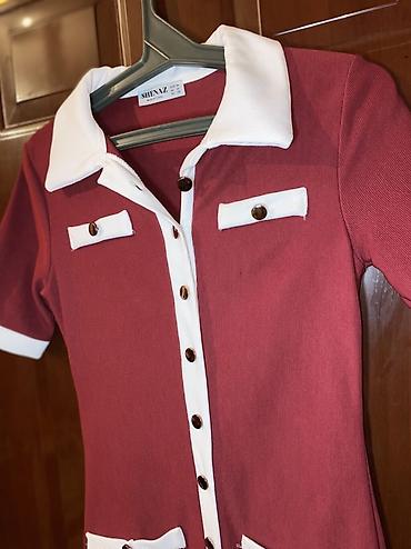 - Rəng: tünd qırmızı (bordo) əsas, ağ kontrast yaxa, manjet və ön bənd