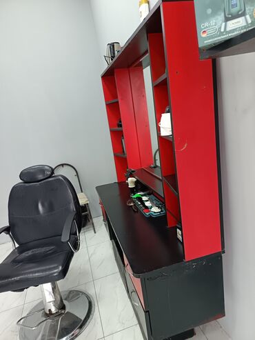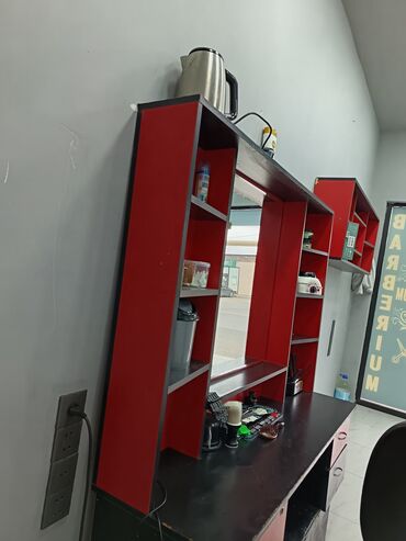 - Komplekt: geniş güzgülü bərbər masası (üst panelli) + uyğun divar rəfi